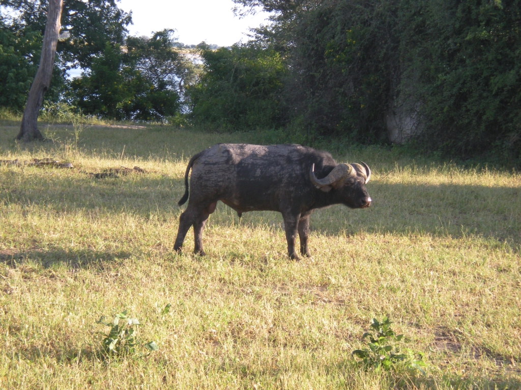 An African Cape Buffalo (Syncerus caffer) grabs a bite to eat in Chobe National Park.