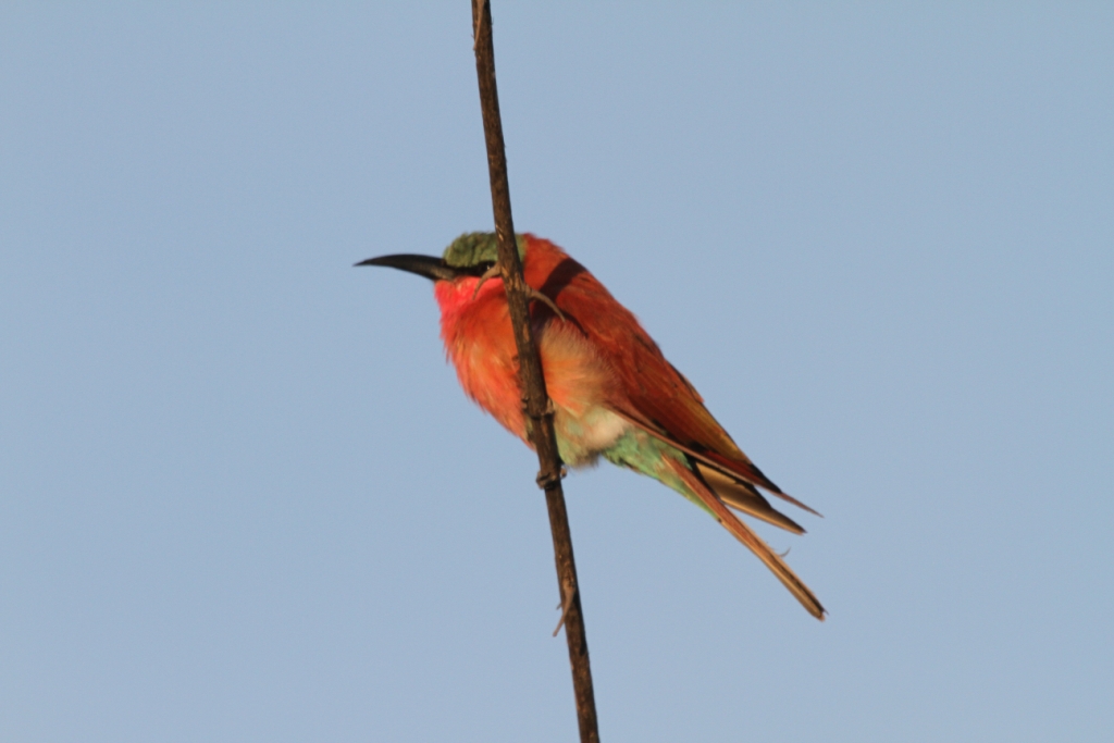 A Southern Carmine Bee-eater (Merops nubicoides) catches sunrise in Chobe National Park